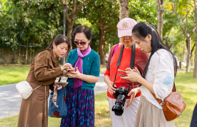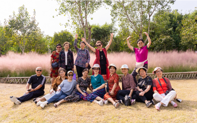 老同志们还在园区种满粉黛乱子草的梯田花海间和亲水观景平台中合影留念,记录下美好的瞬间。