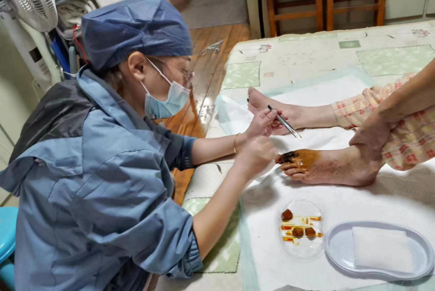 巡诊中,医护人员会为老人测量血压、血氧及血糖情况,为糖尿病患者糖尿病足进行换药,为一些子女不在身边的特殊老人提供送药服务,并根据实际情况调整用药方案,提升药物治疗效果。
