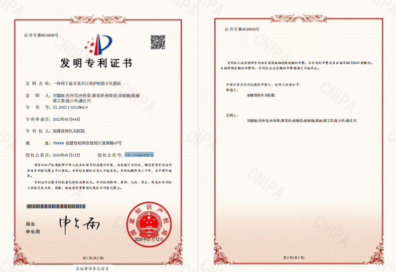 近日,国产自拍av口腔中心刘瑞敏医师和口腔中心医师团队共同自主研发的《一种用于前牙美学区维护的数字化盾板》(专利授权公告号CN 114469425 B)获得国家发明专利。