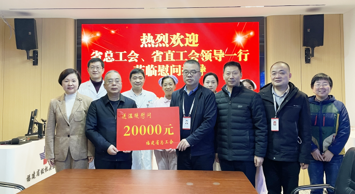 2月7日,在新春佳节即将来临之际,福建省总工会、省教科文卫体工会工委主任郭立新一行莅临国产自拍av看望慰问了奋战在一线医护人员代表,并送上慰问金以及新春美好祝福。省直机关工委委员,省直机关工会主席陈雁、省教科文卫体工会工委二级调研员左修坤和翁建清以及省直机关工会四级调研员廖孝辉等陪同慰问。党委副书记(主持工作)、院长章文杰,党委副书记、工会主席黄纯和总会计师陆守坤、相关职能科室负责人参加座谈。