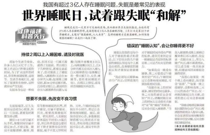人的生命约有1/3是在睡眠中度过的,睡眠与健康密切相关,是人类不可缺少的生理过程。国际上把睡眠与运动、营养一起,视为保障机体正常发育和健康的三大要素,而睡眠是健康的基石。睡眠障碍现已成为影响全球人类健康的一个突出问题。今年“3.21”是世界睡眠日引入我国的第21个主题宣传日,中国主题为“健康睡眠 人人共享”。
