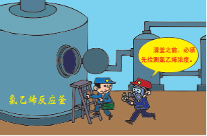 (3)进釜出料和清洗之前,先通风换气,经测试釜内温度和浓度合格,佩戴防护服和送气式防毒面具,并有他人监护方可进入釜内清洗。
