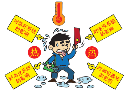 对泌尿系统的影响。高温下,人体的大部分体液由汗腺排出,经肾脏排出的水盐量大大减少,使尿液浓缩,肾脏负担加重。对神经系统的影响。在高温及热辐射作用下,肌肉的工作能力、动作的准确性、协调性,大脑反应速度及注意力降低。