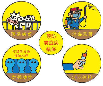 炭疽是由炭疽杆菌引发的一种人畜共享的急性传染病,人因接触病畜及其产品而发生感染。炭疽的危害很大,能使受害者在36小时内窒息、大量出汗、休克,直至死亡。由于破损的皮肤接触感染动物或感染动物制品,如皮、毛、骨、肉等,或吸入含有炭疽芽孢的尘埃等,均可感染炭疽。