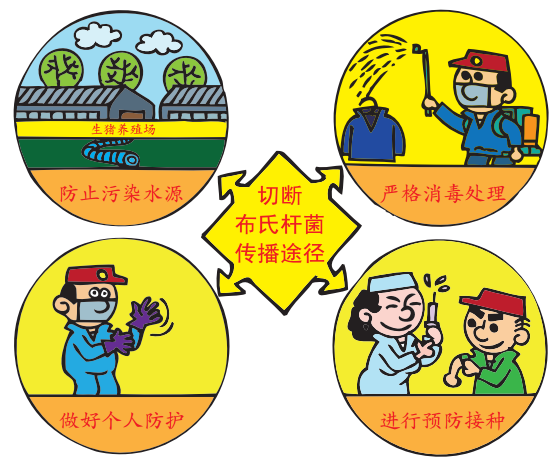 切断布氏杆菌传播途径的方法有:加强粪、水管理,防止病畜或病人的排泄物污染水源;污染的场地、用具均需严格消毒处理;为病畜接生人员,屠宰场及皮、毛、乳、肉加工厂等工作人员应穿工作服、戴口罩及手套,做好个人防护;牧民、兽医等相关职业人员、实验室工作人员及疫区人群均应进行预防接种。