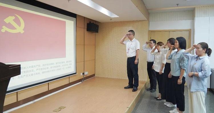 党委副书记(主持工作)、院长章文杰为新发展党员佩戴党徽,并嘱咐他们要牢记党员身份责任,积极践行初心使命,时刻以党员的标准严格自律、积极工作,努力奋斗、敬业奉献,为国产自拍av 的高质量发展贡献力量。在党旗下,章文杰带领全体党员重温入党誓词,铿锵誓言彰显对党的忠诚与热爱,坚定为共产主义和人民卫生健康事业奋斗终身的决心。