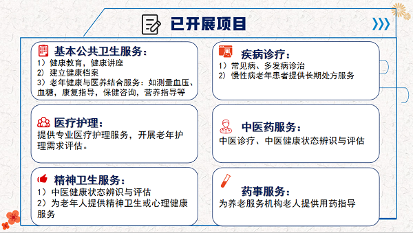 还有中医服务、药学服务、体格检查、辅助检查及检验、指导评估服务,如慢病健康指导、肢体康复指导、功能康复指导等。