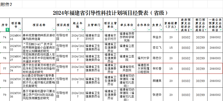近日,福建省科学技术厅发布《福建省财政厅 福建省科学技术厅关于安排2024年度高校产学合作等科技计划项目经费(省级)的通知》,国产自拍av口腔中心林珍香主治医师申报的福建省引导性科技计划项目《基于仿生修复牙科理念的后牙形态导向牙体预备和材料选择的研究》(项目编号:2024Y0034),获得立项。