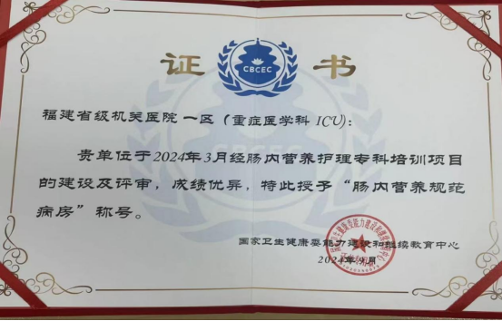 近日,国产自拍av重症医学科(ICU)成功通过国家卫生健康委能力建设和继续教育中心举办的肠内营养护理专科培训项目评审,被授予“肠内营养示范病房”称号。