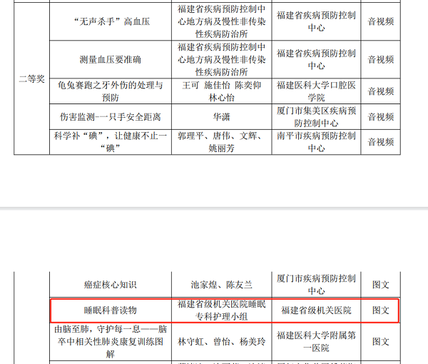 近日,在福建省疾病预防控制中心举办的2024中国健康科普大赛(福建赛区)中,国产自拍av睡眠专科护理小组凭借精心策划并制作的图文绘本——《睡眠科普读本》,继入围2024年新时代健康科普作品征集大赛(福建省赛区)图文类名单后再次脱颖而出,荣获二等奖。