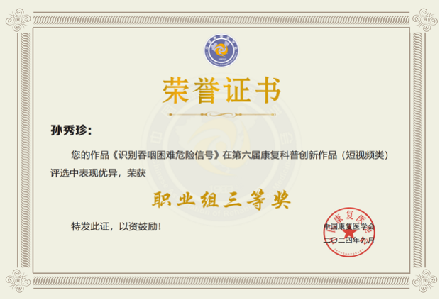 康复科孙秀珍医生的“识别吞咽困难危险信号”科普视频获第六届全国康复科普创新作品(短视频类)职业组三等奖。