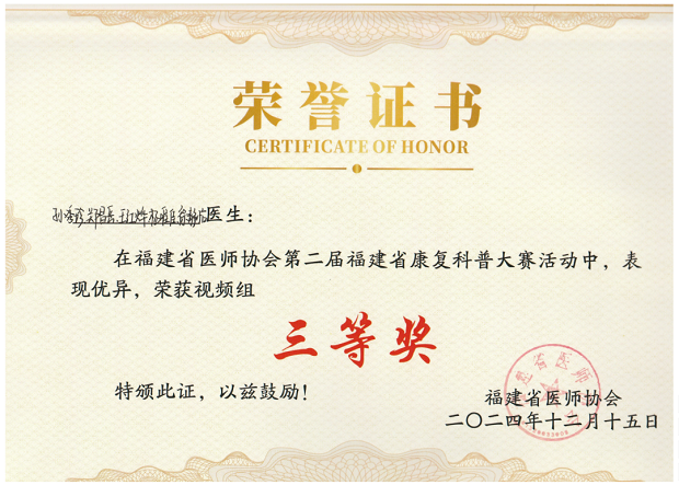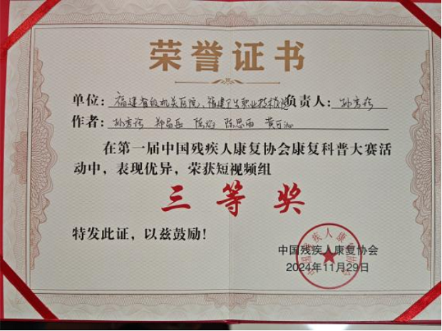 康复科团队“骨松,骨不松,操练起来吧”科普视频及“一咽到底-肌少症吞咽困难咽部训练技巧”获福建省医师协会第二届福建省康复科普大赛三等奖。