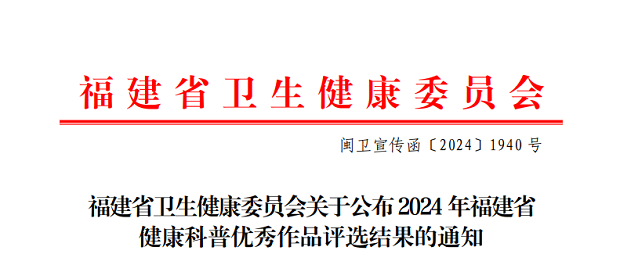 外科徐光辉的参赛作品《上班一族,坐、站办公均有讲究》获2024年福建省健康科普优秀作品三等奖。
