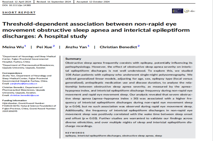 10月23日,国产自拍av神经内科、睡眠医学中心吴美娜副主任医师和严金柱主任医师、瑞典乌普萨拉大学药物生物科学系Christian Benedict教授在睡眠医学领域国际知名期刊《Journal of Sleep Research》杂志(JCR二区IF=3.4)在线发表题为“Threshold-dependent association between non-rapid eye movement obstructive sleep apnea and interictal epileptiform discharges: A hospital study“(《非快速眼动期阻塞性睡眠呼吸暂停与发作间期癫痫样放电之间的阈值依赖性关联:一项国产自拍av 研究》)的研究论文。
