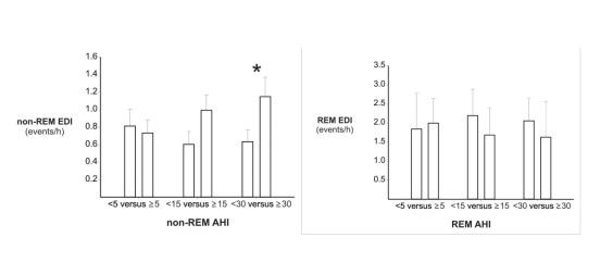 文章指出:OSA严重程度与整体睡眠受损的指标相关,例如入睡后醒来时间增加。此外,NREM睡眠期间的IED指数比REM睡眠期间高。NREM睡眠期间OSA事件与IED指数存在阈值依赖性关系,重度OSA患者的NREM期的IED升高。而在REM睡眠期间没有观察到如此显著的阈值依赖性关联。此外,每小时每增加一个NREM IED,入睡后觉醒时间平均增加13.9分钟。