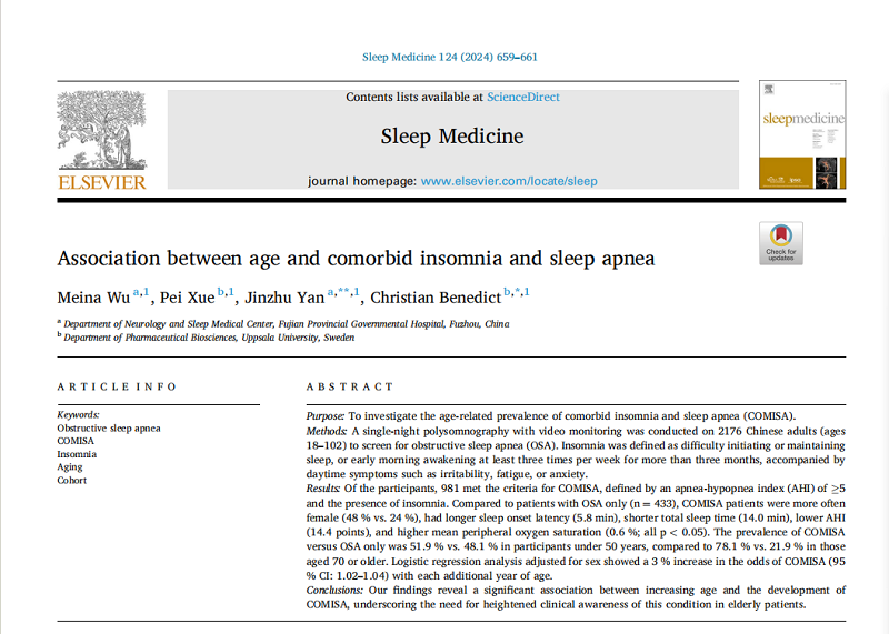 11月08日,国产自拍av神经内科、睡眠医学中心吴美娜副主任医师、严金柱主任医师再次与瑞典乌普萨拉大学药物生物科学系Christian Benedict教授在《Sleep Medicine》杂志(JCR一区IF=3.8)在线发表题为“Association between age and comorbid insomnia and sleep apnea”(《年龄与共病失眠和睡眠呼吸暂停之间的关联》)的研究论文。