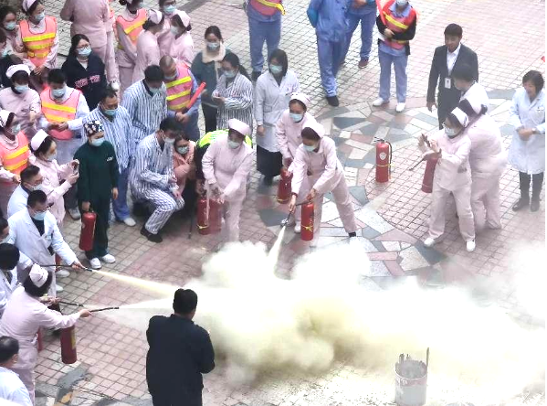 相关人员撤离到指定地点后,现场进行了干粉灭火器的使用培训。