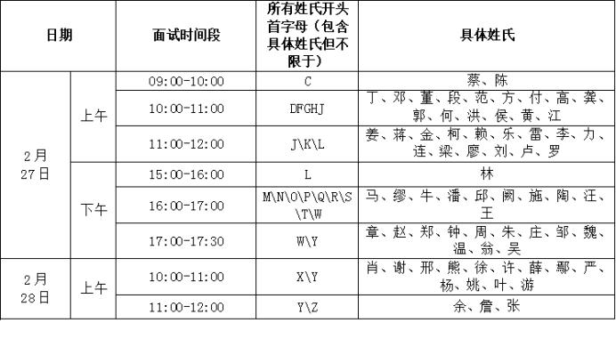 1.如2月27日上午9点到10点时间段,所有姓氏开头为“C”的考生均可到现场参加面试;