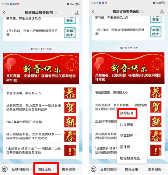2.点击底部菜单栏“便民应用”,之后点击“预约挂号”