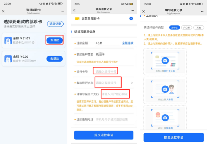 选择有余额的就诊卡,发起退款。输入退款金额、银行卡信息(银行卡号、收款银行名称及开户行信息)手机号、身份证证件号码等信息,并上传银行卡正面及身份证正反面图片,提交退款申请。
