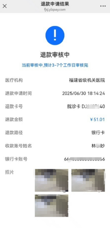 ② 到账时间:退款金额于3至7个工作日退回患者本人银行卡,如遇节假日顺延。