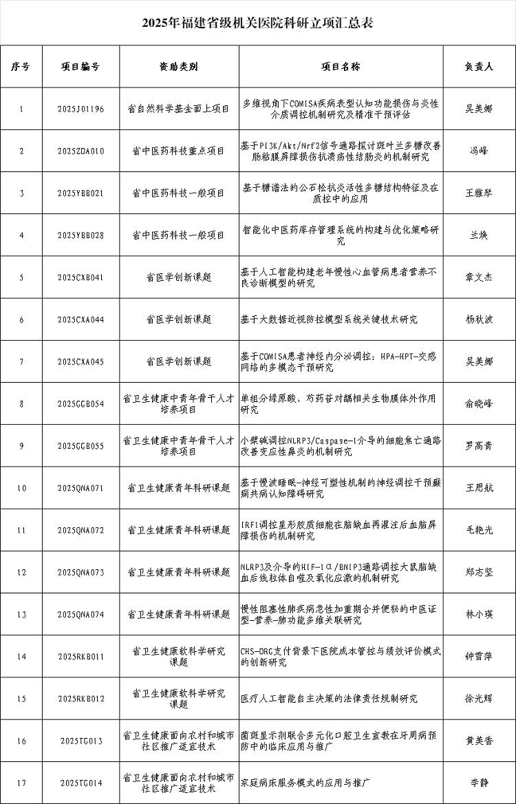 此次立项的省自然科学基金面上项目“多维视角下COMISA疾病表型认知功能损伤与炎性介质调控机制研究及精准干预评估”,由神经内科吴美娜副主任医师团队牵头攻关。该项目的成功立项,不仅是对团队深耕科研的高度认可,更标志着医院在该学科领域的学术积淀与创新突破获得业界充分肯定,为学科发展注入新动能。
