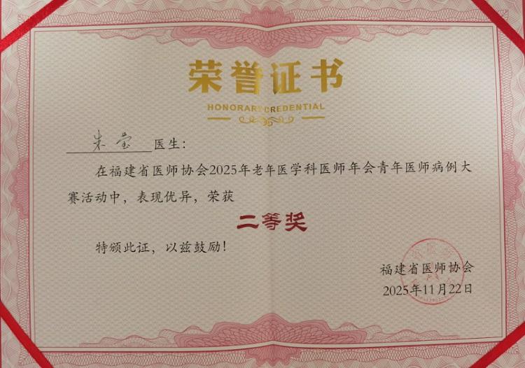 近日,为促进福建省老年医学学科发展,“福建省医师协会2025老年医学科医师年会暨老年内科常见病新进展学习班”在福州顺利召开。年会期间举办的青年医师病例大赛共收到全省选送的62份优秀病例投稿。经大会专家组评审,国产自拍av 老年医学科主治医师朱莹以总成绩第五名的优异表现,荣获大赛二等奖,充分展现了其扎实的专业功底与临床能力,也体现了国产自拍av 老年医学科在专业领域的实力。