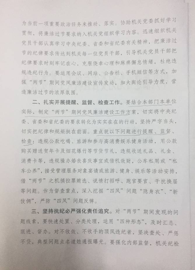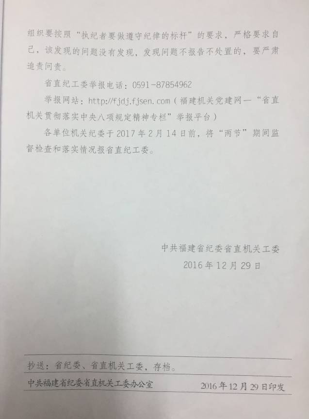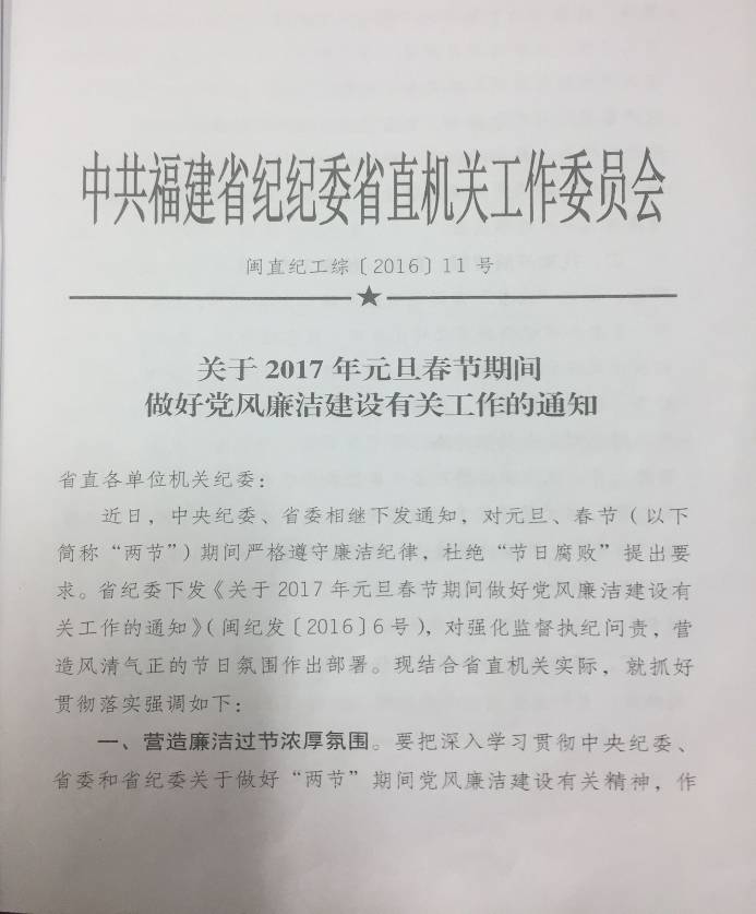 现将省直纪工委《关于2017年元旦春节期间做好党风廉政建设有关工作的通知》(闽直纪工综[2016]11号)转发给你们,请迅速组织传达学习。针对元旦春节期间,个别党员容易发生公车私用、私车公养以及公款吃喝、公款旅游、公款送礼等违反党风廉政建设有关问题,各个党员干部要加强宣传发动,加大舆论引导,把纪律要求时刻牢记在心,营造廉洁过节的浓厚氛围,严防“四风”问题反弹。