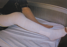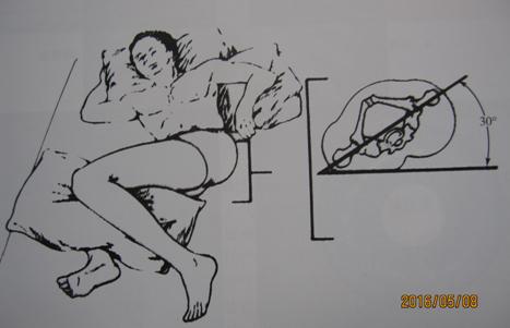 (1)病人体位:取侧卧位,上面腿部膝盖朝向胸部,保持此姿势到操作完成10分钟后,待造口袋粘贴稳固才翻身以增加造口袋粘贴的牢固性。
