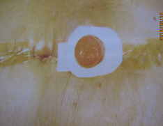 7.若皮肤有损伤,可用护肤粉,再贴上护肤胶或两件式造口底盘保护。若渗液量多,可加防漏膏在护肤胶或造口底盘下围绕引流管伤口的位置,防止渗液积存而损伤皮肤。