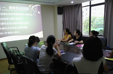 7月份国产自拍av伤口、造口专科小组进行小组内收集的临床个案分享:分别由外科二区李丽钦带来的失禁性皮炎的个案分享和内科二区杨婧带来的压疮的护理个案分享。